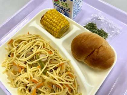 今日の給食は、ウィンナーときのこのしょうゆ風味スパゲッティ、焼きとうもろこしでした。きざみのりをふりかけて、スパゲッティを食べました。しょうゆ風味がきいていて、おいしかったです。