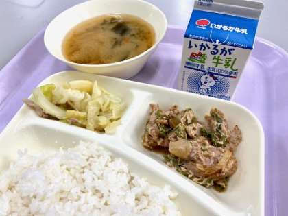 今日の給食は、鶏肉のごまだれ焼き、なめこのみそ汁、キャベツのいためものでした。鶏肉はみんな大好きだったみたいで、喜んで食べていました。