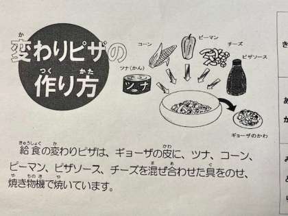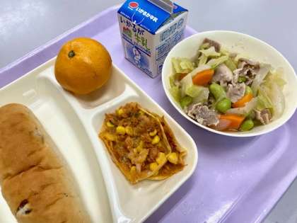 今日の給食は、豚肉と野菜のスープ煮、変わりピザ、みかんでした。変わりピザというのは、家庭でも簡単にできるピザです。手軽でおいしいです。