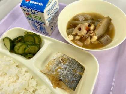 今日の給食は、さごしのおろししょうゆかけ、大豆と冬野菜の煮物、きゅうりのしょうがづけでした。お魚と煮物で、ほっこりとした和定食、ごちそうさまでした。
