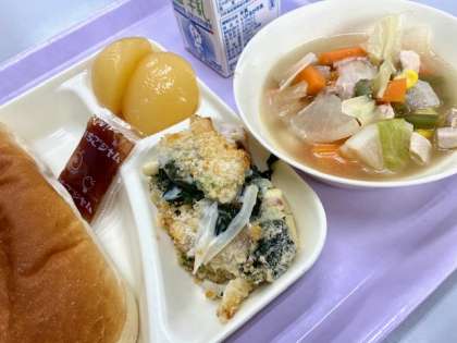 11月最後の献立 公開日 2020/12/01 更新日 2020/12/01 お知らせ 11月最後の給食は、スープ煮、ほうれん草のグラタン、白桃でした。大きな桃を一口で食べる子もいて、笑顔いっぱいの教室でした。 いいね(0)