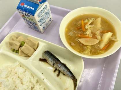 今日の給食は、いわしのしょうが煮、みそ汁、高野どうふの煮物でした。骨まで柔らかくなるまで煮てあるいわしは、そのままで食べることができます。小さい子たちも骨まで食べていました。