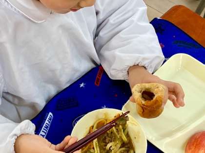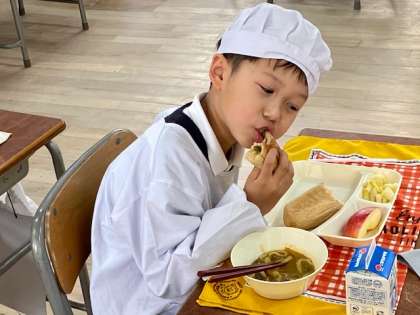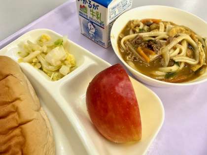 今日の給食は、カレーうどん、白菜のおひたし、りんごでした。あったかいカレーうどんが、うれしい季節です。でも、子どもたちが食べると、「カレーうどんパン」になるのです。これ、おいしいらしいです。