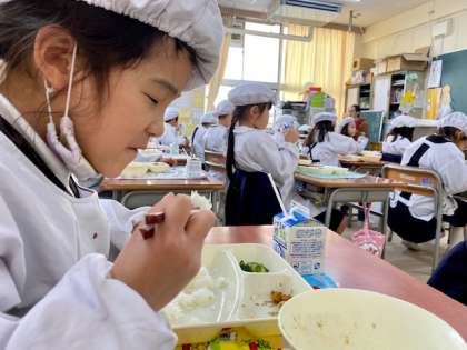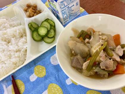 今日の給食は、鶏肉と野菜の煮物、じゃこ豆、あっさりきゅうりでした。じゃこ豆は大好きな子もいて、山盛りで食べていました。