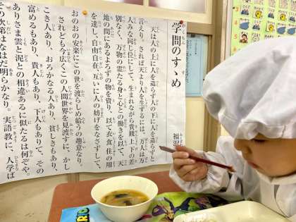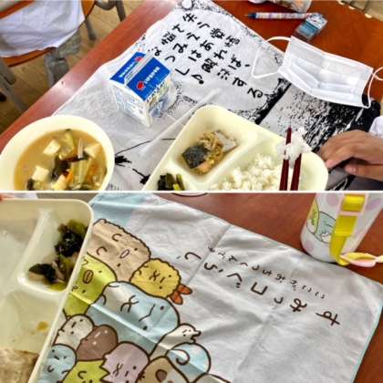今日の給食は、さばのみぞれがけ、みそ汁、小松菜の煮びたしでした。さばは、少し骨があったので、みんな慎重に食べていました。
