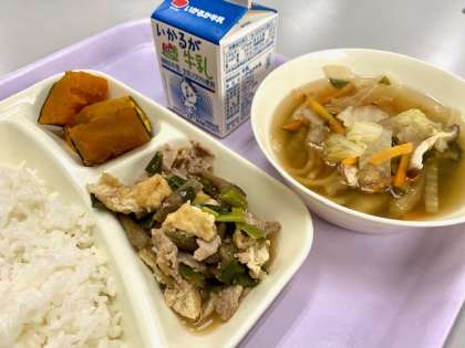 今日の給食は、豚肉と干しずいきのみそ煮、すまし汁、焼きかぼちゃの甘みつかけでした。ずいきを知らない子がたくさんいて、「先生、これなに?」と聞いてきました。ずいき、わけぎ、とうがんといった食材がめずらしくなってきました。
