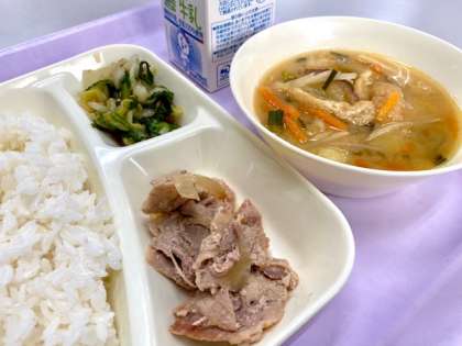 今日の給食は、豚肉のしょうが焼き、さつまいものみそ汁、菊菜と白菜のごまあえでした。さつまいもがごろっと入ったみそ汁が、ありがたかったです。