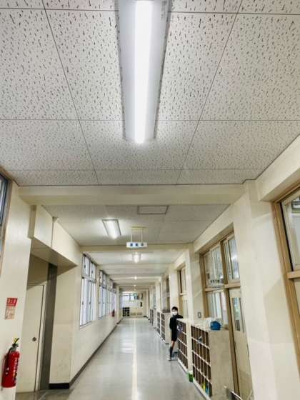 大国小学校では一昨年度から、校舎内蛍光灯のLED化を進めています。一昨年度は職員室や事務室、保健室、管理作業員室など、昨年度は各学年教室と一階廊下のLED化工事を行いました。