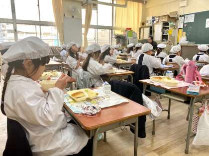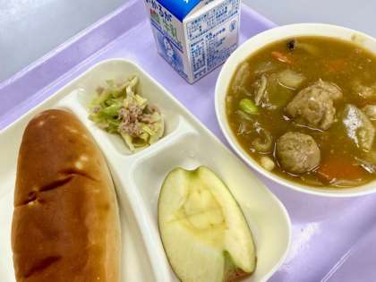 今日の給食はミートボールと野菜のカレー煮、ツナとキャベツのソテー、リンゴでした。きちんと前を向いて、静かに給食を食べています。