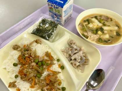 今日の給食は、鶏ごぼうご飯、みそ汁、焼きれんこんでした。れんこんが好きな子が多くて、お皿にいっぱい食べていました。