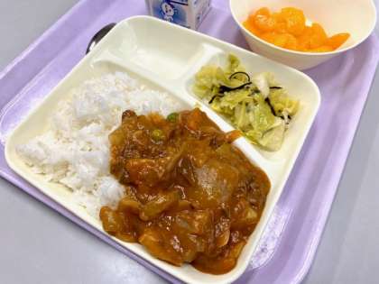 今日の給食は、ハヤシライス、キャベツのひじきドレッシング、みかん(缶)でした。コクがあるハヤシライス、本格的な味がしました。