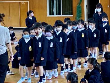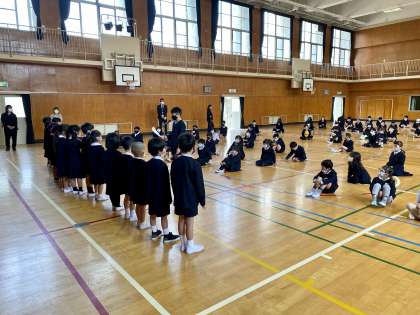まず、3人の転入生と新しい9人の教職員を子どもたちに紹介しました。