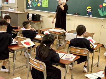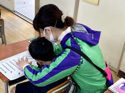 プリントに線を書くたびに、先生から花マルをつけてもらいます。