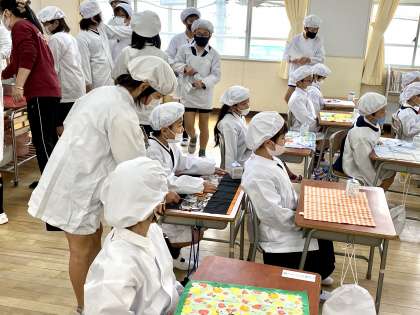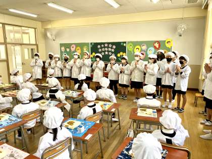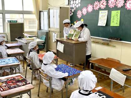 小学校で食べるはじめての給食は、6年生がお世話をしてくれます。給食の運搬から、配膳まで、すべて準備します。今日は、絵本の読み聞かせまでありました。