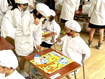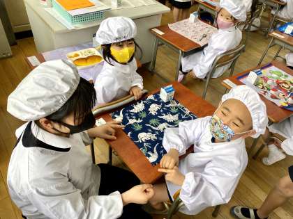今日も6年生が1年生の教室にやってきました。給食を運び、じゃんけんをしました。6年生は、すこしずつ1年生の名前をおぼえています。