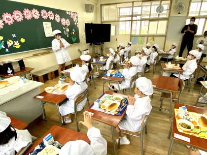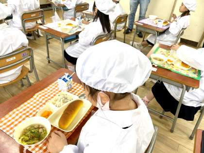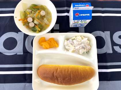 今日の給食は、マカロニグラタン、レタスのスープ、みかん(缶)にパンプキンパンでした。
