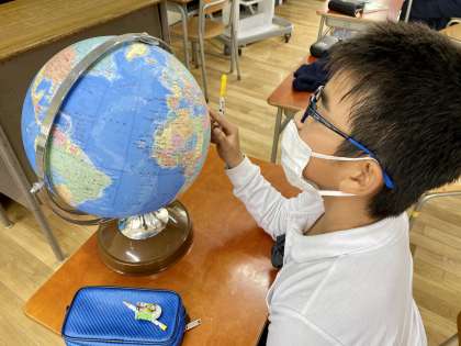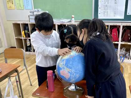 5年生は地球儀をもとに、みんなで何かを調べていました。
