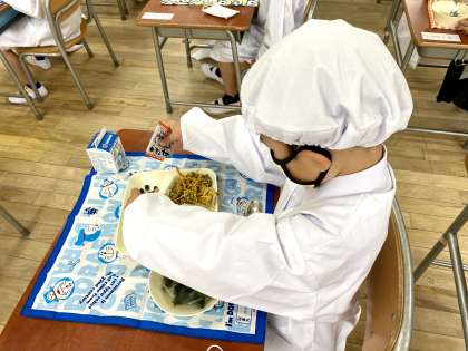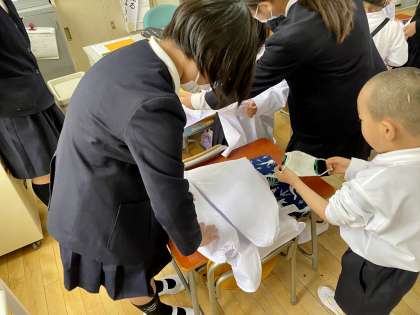 配膳だけでなく、食後もお世話をするために6年生が来てくれています。