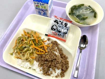 今日の給食は、ビビンバ、トック、煎り黒豆でした。