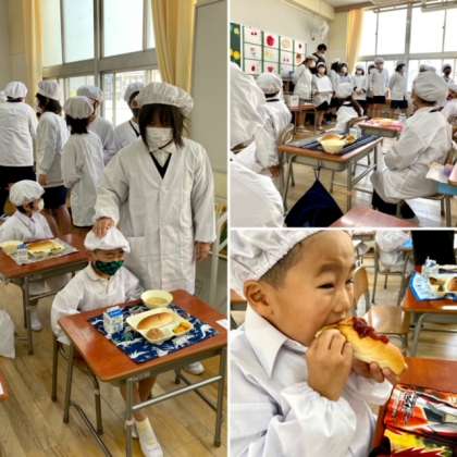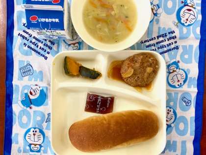 今日の給食は、煮込みハンバーグ、コーンスープ、焼きかぼちゃでした。