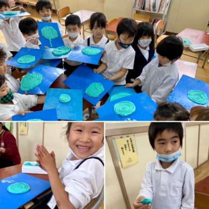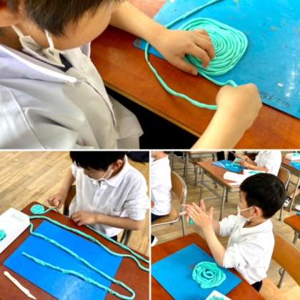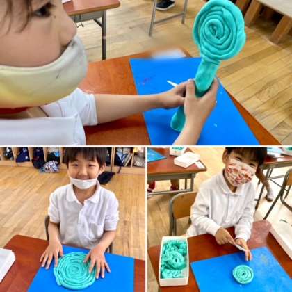 粘土をながーく伸ばして、クルクル巻き上げると、ペロペロキャンディーのできあがり。
