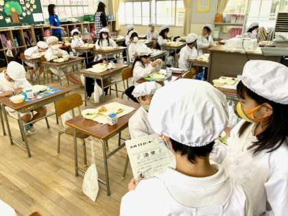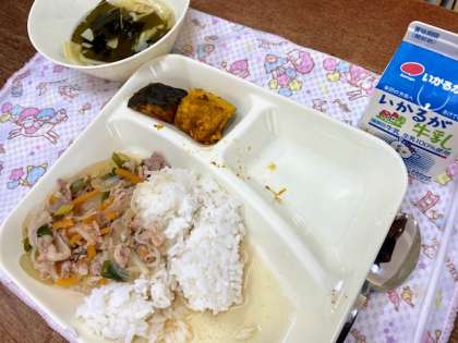 今日の給食は、豚丼、ゆばのすまし汁、かぼちゃのしょうゆ焼きでした。