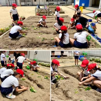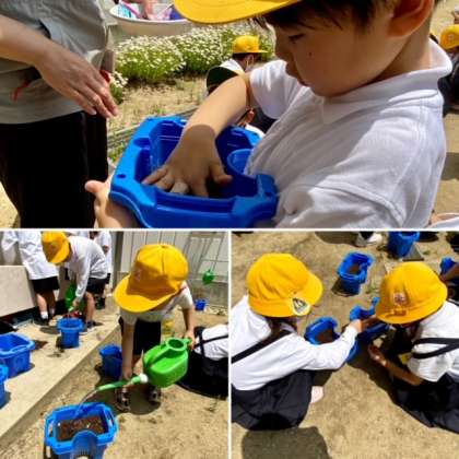 1年生はアサガオの種、2年生はサツマイモの苗を植えました。