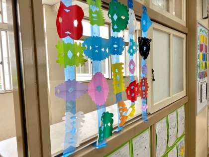 1年生の教室の窓には、子どもたちがつくった飾りが風にゆれています。