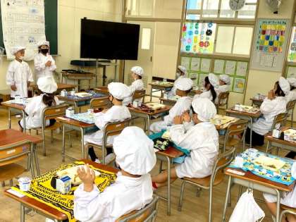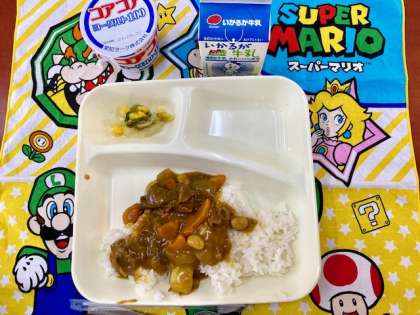 今日の給食は、牛肉と大豆のカレーライス、レタスとコーンのサラダ、ヨーグルトでした。みんなの大好きな献立でよかったですね。