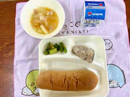 今日の給食は、かつおのガーリックマヨネーズ焼き、ベーコンと野菜のスープ、グリーンアスパラのソテーでした。かつおは、とてもやわらかく、よろこんで食べていました。