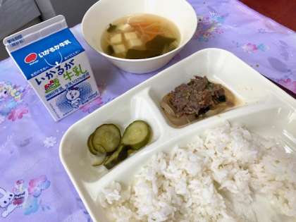 今日の給食は、プルコギ、とうふのスープ、きゅうりの甘酢づけでした。