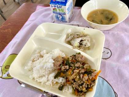 今日は、そぼろ丼 公開日 2021/06/07 更新日 2021/06/07 お知らせ 今日の給食は、豚ひき肉とニラのそぼろ丼、みそ汁、キャベツの赤じそあえでした。子どもたちは、丼物が大好きです。 いいね(0)