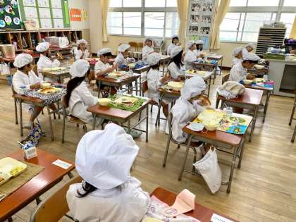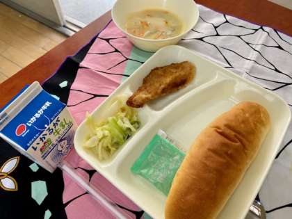 今日の給食は、サーモンフライ、豆乳スープ、キャベツのソテーでした。サーモンフライが食べ応えがありました。