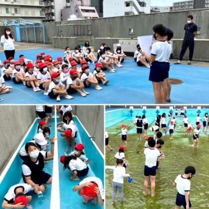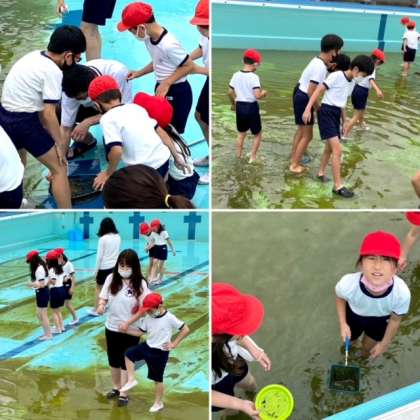 2・6年生が、プール清掃前にヤゴを救出しました。昨年の秋にトンボの産卵場所を浮かべたのは、2年生(当時1年生)でした。今年は、はじめてプールにも入ります。6年生がプールの入り方を教えてくれました。