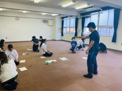 本校教員が放課後に、救命救急講習会を行いました。胸骨圧迫や人工呼吸、気道異物の除去の方法、AEDの使い方について、実際に声に出して行動しながら、確認し合いました。