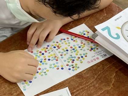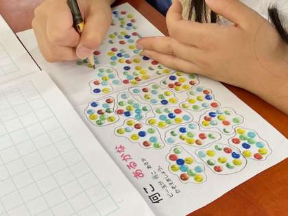 2年生の算数で、ビー玉の数をかぞえる課題がでました。子どもたちは、10個ずつのまとまりを作りながら、数を確かめていました。1年生の学習をもとに100以上の数をかぞえています。