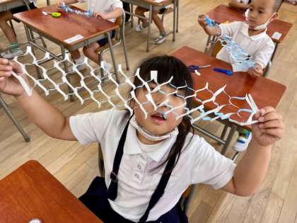 1年生は、七夕に向けて笹飾りを作り始めています。折り紙を切って、じょうずに広げたら、かわいい飾りができました。