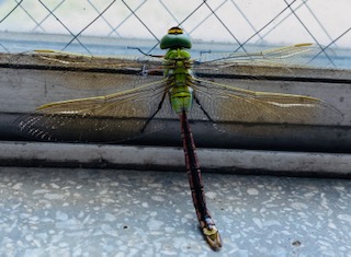 昨日の朝、子どもたちが登校すると、1匹のギンヤンマがヤゴからかえり、窓にとまっていました。