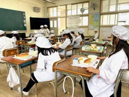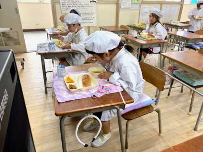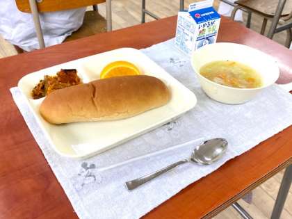 今日の給食は、かぼちゃのミートグラタン、スープ、オレンジでした。