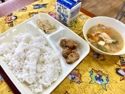 今日の給食は、豚肉の香味あげ、みそ汁、もやしのおひたしでした。
