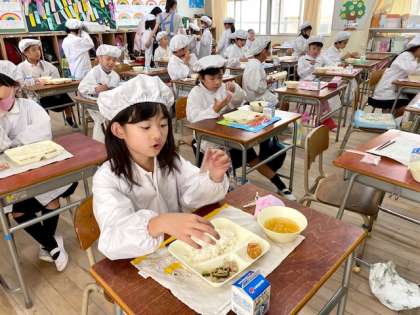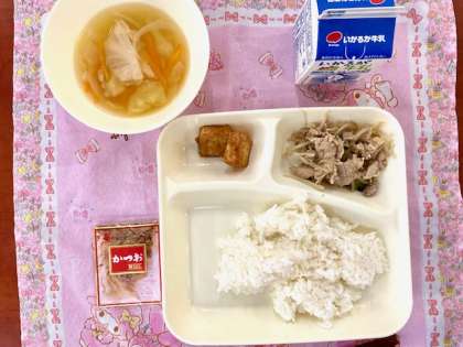 今日の給食は、ゴーヤチャンプルー、すまし汁、あつあげのしょうが醤油かけでした。ゴーヤが苦手という子もいましたが、そんなに苦くなかったので、よく食べていました。