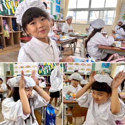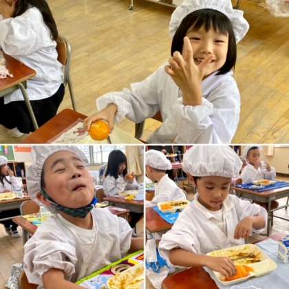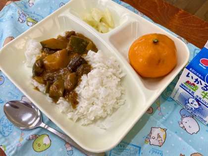 今日の給食は、夏野菜のカレー、キャベツのサラダ、冷凍みかんでした。