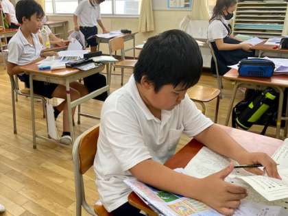 5年生は、夏休みの課題に取りかかっていました。自分たちの力で、やり切ることができるように、今年からは新しい宿題の出し方にしています。まず、できるようになることを目指していますので、温かい目でみてやってください。