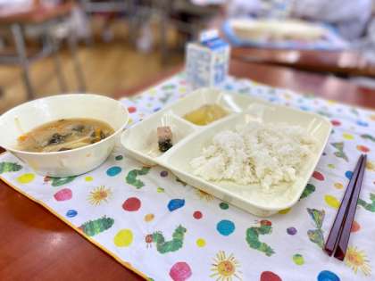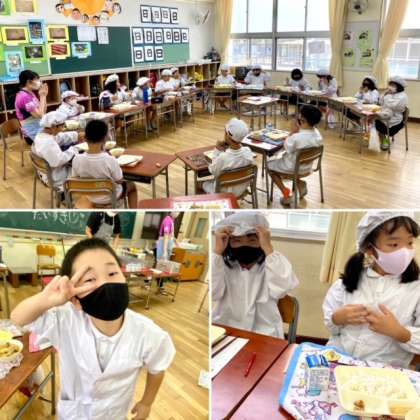 1学期最後の給食は、さけのつけ焼き、みそ汁、とうがんの煮物でした。