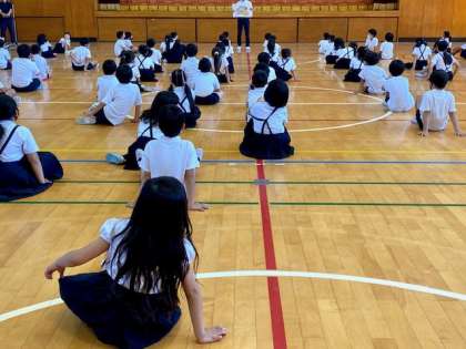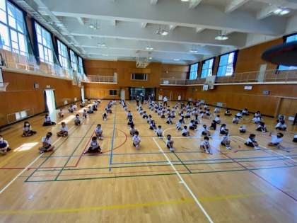 終業式は、全校児童が講堂に集まって行いました。しめくくりはリモートではなく、一人ひとりの居る場所を確かめながら、語りかけました。