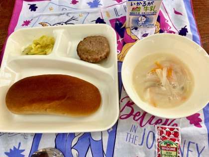 今日の給食は、焼きハンバーグ、豆乳スープ、キャベツとピーマンのカレーソテーでした。