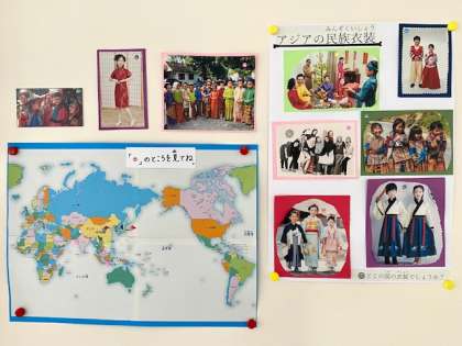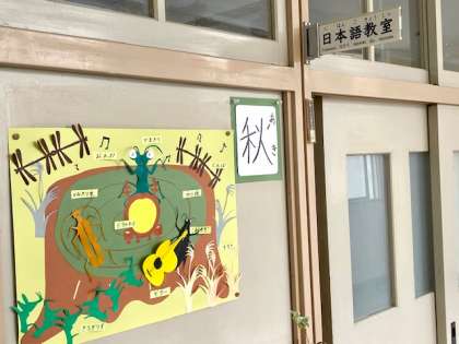 日本語教室に通ってくる子どもたちに、日本の秋を感じてもらう飾りつけをしています。季節感は、国によって違うものです。それに応じて、服装も家のつくりも異なります。