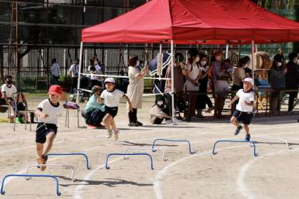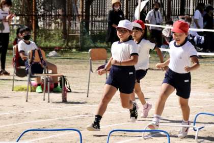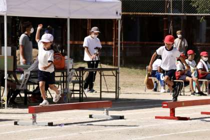 1・2年障がい物走。ころばずに、障がい物を乗り越えていました。
