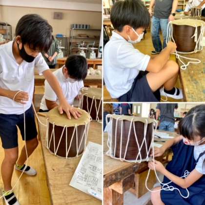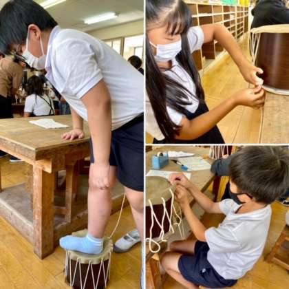 5年生が太鼓づくりをしました。やわらかくした皮を切り、穴をあけて、ひもを通して絞めていきます。とても力がいる作業ですが、みんな真剣にやり切りました。どんな音がするか、楽しみです。