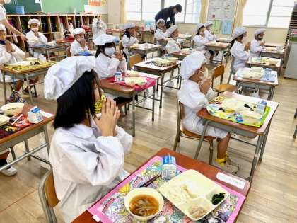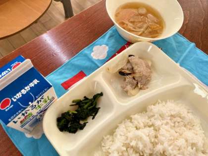 今日の給食は、鶏肉のゆず塩焼き、ソーキ汁、ほうれん草のおひたしでした。沖縄の風味がとてもおいしかったです。